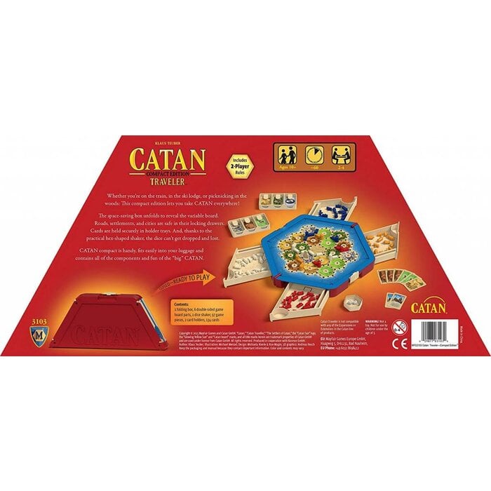 Whether you're on the train, in the ski lodge or picnicking in the woods: This compact edition lets you take CATAN everywhere! The space-saving box unfolds to reveal the variable board. Roads, settlements and cities are safe in their locking drawers. Cards are held securely in holder trays. Even the dice, thanks to the practical hex-shaped shaker can't get dropped and lost.