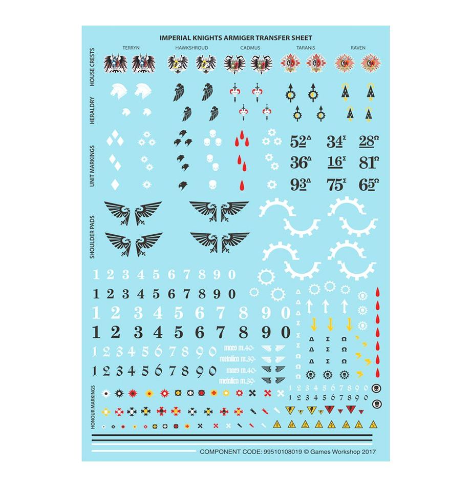 This kit comprises 148 plastic components, and is supplied with 2x Citadel 100mm Round Bases. Also included is an Armiger transfer sheet, featuring heraldry for Imperial Knights. These miniatures are unpainted and require assembly – we recommend using Citadel Plastic Glue and Citadel paints.