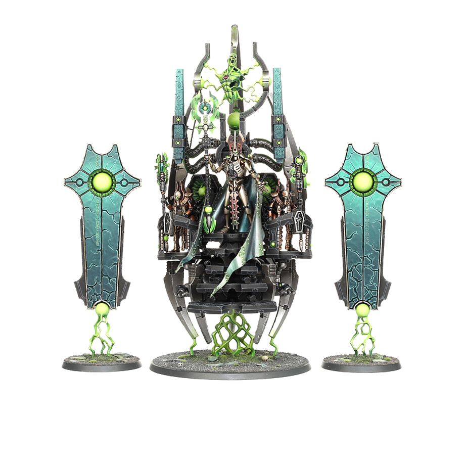 The Silent King rides to war aboard his Dais of Dominion, flanked by the phaerons of his Triarch and orbited by crackling noctilith Menhirs. He unleashes god-like powers of annihilation upon his dismayed foes, even as his absolute authority radiates out to empower the Necron legions and drive them to inevitable victory.