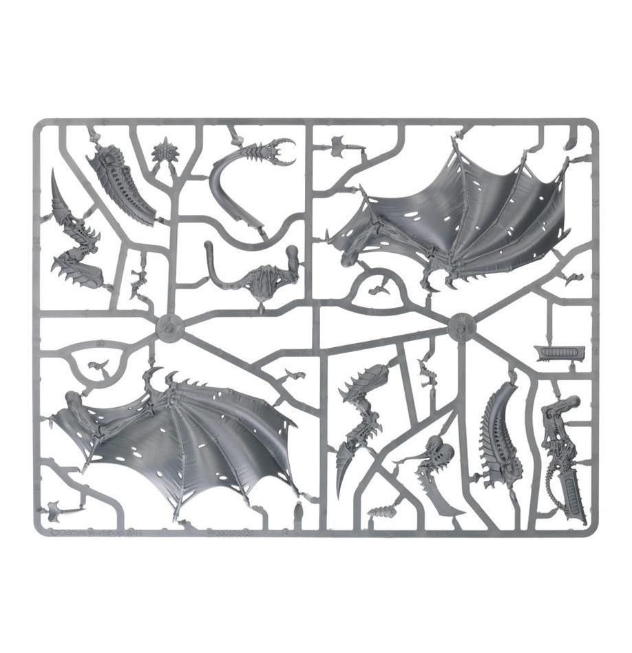 This multipart plastic kit builds one Hive Tyrant, an impressive and incredibly versatile leader-beast that can be built to take on a variety of battlefield roles. This looming creature is a fitting centrepiece for any Tyranid army – it boasts a distinctive chitinous shell studded with chimneys, a snarling head with a cruel horn, and a hideous skeletal underbody. The kit features a huge variety of weapons options, including two scything talons, a heavy venom cannon, a stranglethorn cannon, and a bonesword and a lash whip – as well as biomorphs like adrenal glands and toxin sacs, plus other components for customising your Hive Tyrant. You can also choose to build this kit as flying Winged Hive Tyrant, or the insidious Swarmlord.