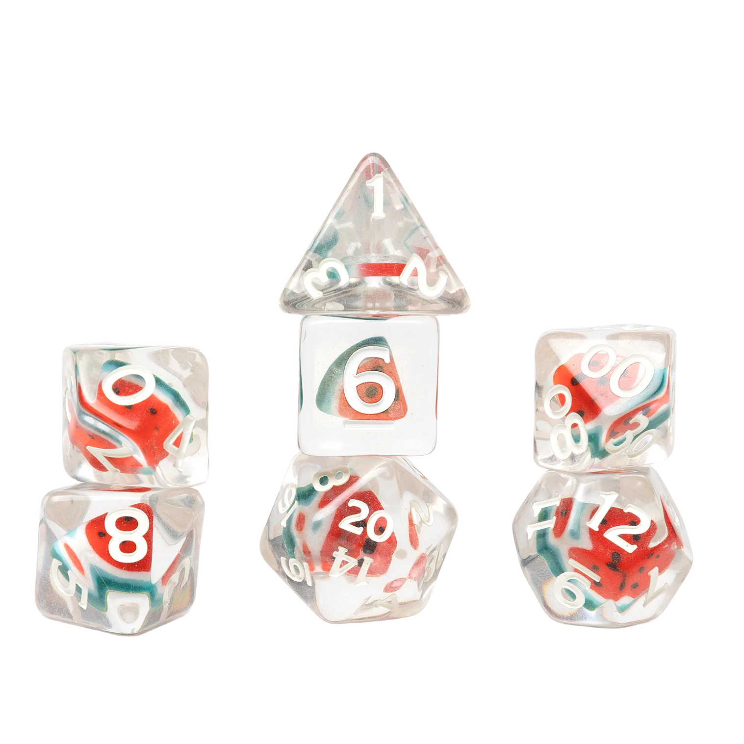 Fresh, vibrant, and full of summer vibes—the Watermelon Slice Dice Set brings a crisp sweetness to your rolls. This 7-piece set features a juicy watermelon slice sealed within, adding a bold splash of red and green to your tabletop adventures. Collect it alongside four other fruity designs in the Fruit Slice Dice series!