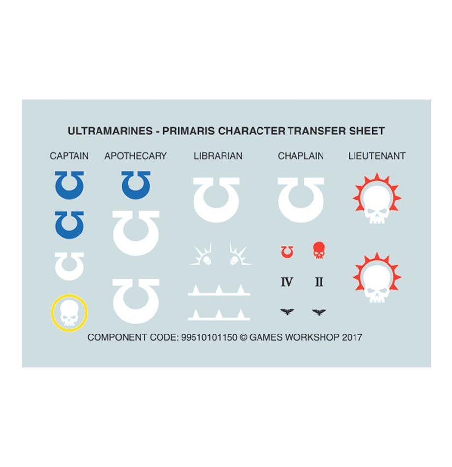 The Chaplain comes as 12 components, and is supplied with a Citadel 40mm Round base. The kit also includes a Space Marines Character Transfer Sheet, which features Captain, Chaplain, Librarian and Lieutenant iconography.