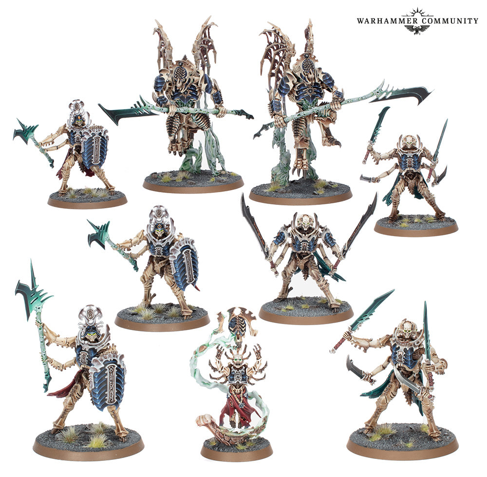 Some of the greatest inventions and adaptations made by the order of the Ossifectors have been developed under the pressure of battle, and the Mortisan Elite is a cadre of veteran constructs deployed to smash aside foes while honing their violent forms. Three Immortis Guard, three Necropolis Stalkers and two Morghast Archai are observed in combat by a Mortisan Ossifector, who makes necessary adjustments to his creations mid-battle.