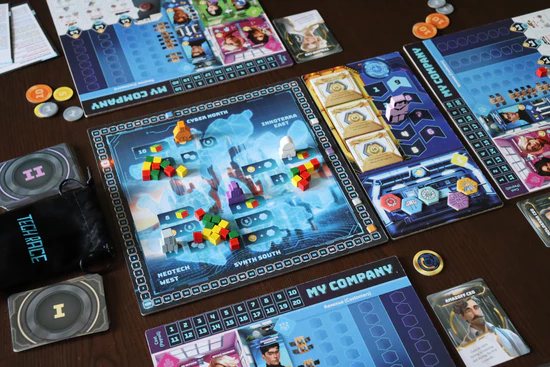 Tech Race is a medium-weight, Euro-style strategy game that simulates the dynamic, fast-paced world of tech startups. Players race to the highest startup valuation through smart hiring, innovation, and lobbying. Fast-paced and strategic, it captures the thrill of growing a company from the ground up with humor and surprises.
